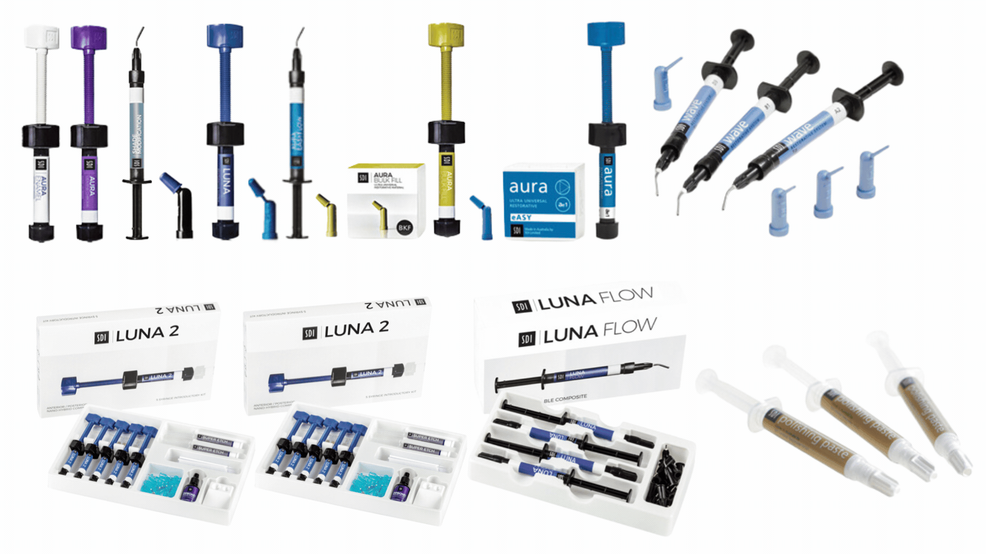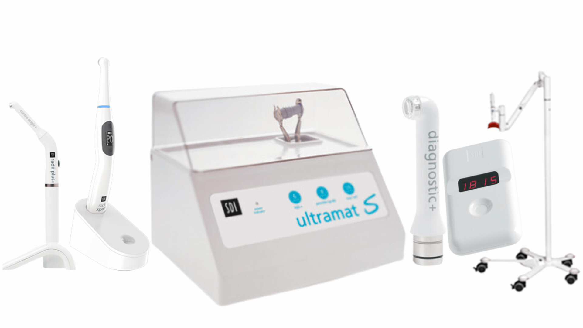 The equipment includes curing lights, mixers, and radiometers for comprehensive dental care.